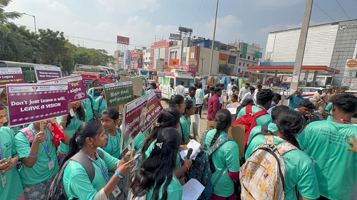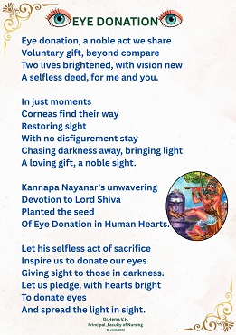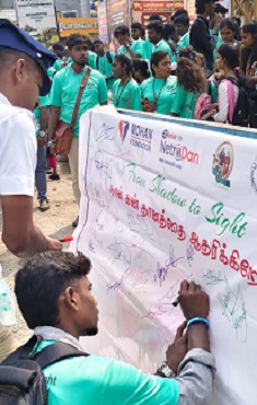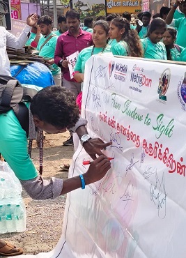 Prior to the walkathon interns and volunteers visited shops along the route and distributed pamphlets to give to their clients. Around 200 NSS volunteers from DRBCC Hindu College enthusiastically participated in the walkathon. The rally commenced from the Avadi Corporation Office and proceeded up to Kamaraj Nagar, capturing public attention through impactful slogans and placards promoting eye donation. Bright placards supporting thought provoking slogans, and students raising slogans in Tamil, caught the attention of the public in the main road. Students also distributed information brochures to public on the road. A signature campaign was also conducted, encouraging members of the public to pledge their eyes. A total of 20 individuals voluntarily pledged their corneas through a special link.