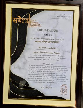 MOHAN Foundation Manipur received the SABERA Award under the category Swasthya and Kalyan (Health, Nutrition and Wellbeing), below Rs. 5 crore, for its sustained efforts in building and strengthening the organ donation and transplantation ecosystem in Manipur. The other nominees in this category included Meals of Happiness Charitable Trust and Sushena Health Foundation.