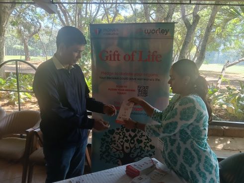 Mrs. Ranjini Shankar the project manager set up at information kiosk with MOHAN Foundation’s standee, flyers, placards, pledge forms and donor cards. The audience were from all over the Karnataka.