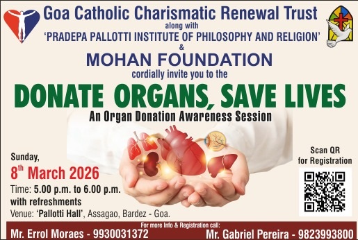 On Sunday, March 8, 2026, Mr. Gabriel Pereira, an Organ Donation Ambassador for the MOHAN Foundation, delivered a talk on organ donation in partnership with the Goa Catholic Charismatic Renewal Trust and the Pradepa Pallotti Institute of Philosophy and Religion in Assagao, Bardez, Goa.