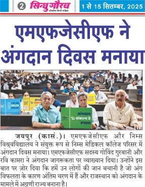 On September 5, 2025 MFJCF, in collaboration with NIMS University, celebrated Organ Donation Day at NIMS Medical College campus. MFJCF members Mr. Govind Gupta and Mr. Ravi Kamra addressed the gathering, highlighting the significance of organ donation and encouraging participants to pledge for this noble cause.