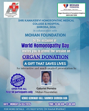 On April 6, 2026, an organ donation awareness session was conducted for the faculty of Shri Kamaxidevi Homoeopathic Medical College & Hospital, Shiroda, Goa, to mark World Homoeopathy Day. The session was delivered by Mr. Gabriel Pereira, Organ Donation Ambassador for MOHAN Foundation.
