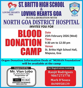 On February 25, 2026, Mr. Gabriel Pereira, Organ Donation Ambassador from the MOHAN Foundation, set up an organ donation information desk at the blood donation camp organised by Loving Hearts Goa in collaboration with St. Britto High School and the North Goa District Hospital Blood Bank (Asilo). The camp was held from 9:30 AM to 1:00 PM. A total of 45 individuals registered for blood donation, of whom 32 successfully donated.