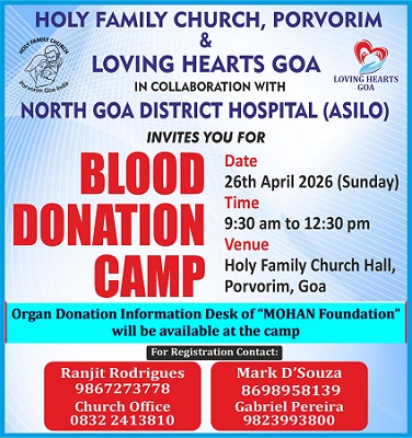 An Organ Donation Information Desk was set up on Sunday, April 26, 2026, during the Blood Donation Camp organised by Holy Family Church, Porvorim, Goa, in collaboration with Loving Hearts Goa and the North Goa District Hospital, Asilo Blood Bank. The camp commenced at 9:30 a.m. and concluded at 12:30 p.m.