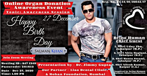 On 27th December 2020, Dr Jimmy conducted an online awareness session on organ donation along with NGO Being Samajik and Sanskritik Sanstha, Jabalpur. Mr Prabhat Barman (Organiser) of Being Samajik and Sanskritik Sanstha, Jabalpur promoted and coordinated the session for Salman Khan fans on the occasion of birthday of celebrity Salman Khan along with other activities like informative stalls, competitions and blood donation camps.