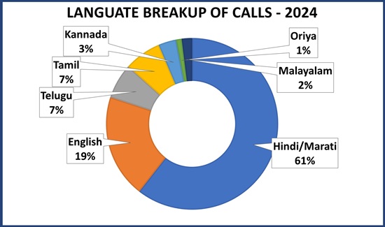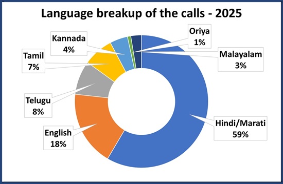 Nearly 50% calls received by the helpline are in Hindi and Marathi language. 25% callers speak in English. The helpline gets more than 70% of calls during office hours. A snapshot of the call distribution is given below.