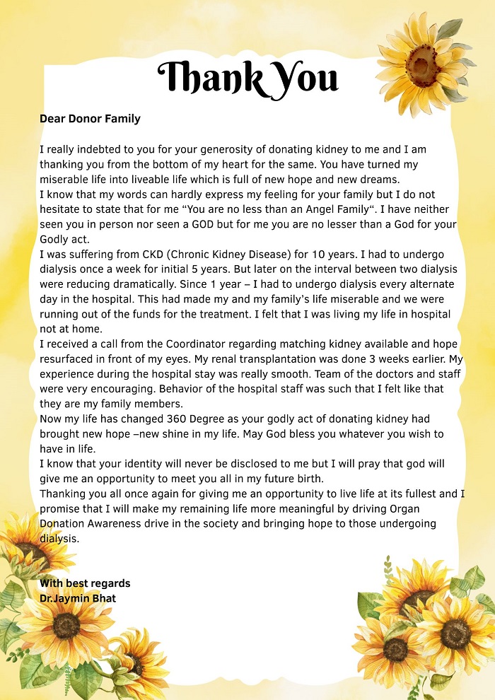 #19 This is to thank you for letting me participate in the session/training on organ donations. Being a transplant recipient myself, I support the cause passionately and sincerely. It was wonderful to interact with the eminent panelists and hear their words. The Q&A session was hugely informative and helped to clarify many doubts. I look forward to taking forward the noble cause in whatever small or big way possible for me. Click here to see the "Thank you letter".