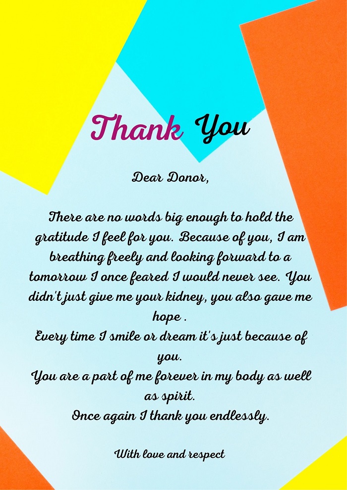 Writing a thank you note helped me understand the importance of a donor family and to not simply take for granted anything. It also led me to think how life changing it is for both the donor and the recipient.